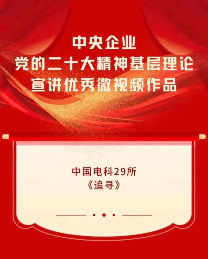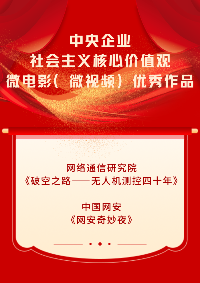 11月7日,第四届中央企业社会主义核心价值观主题微电影(微视频)展映发布仪式在京举行。中国电科微电影作品《破空之路——无人机测控四十年》、《网安奇妙夜》获评中央企业社会主义核心价值观微电影(微视频)优秀作品,微视频作品《追寻》获评中央企业党的二十大精神基层理论宣讲优秀微视频作品。
